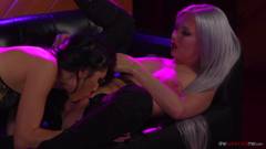 Lésbicas lindas e maduras estão numa casa noturna lambendo as conas uma da outra à luz do néon. Uma loira e uma morena, ambas em lingerie sexy animam!