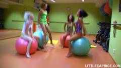 Lésbicas se exercitam juntas em uma academia e ficam tão excitadas quando se veem que começam a transar com um vibrador amarrado nelas.