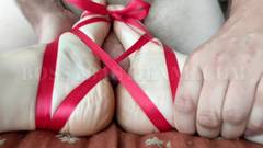 O cara amarra os pés da sua namorada com um laço e desliza seu pau entre eles para uma punheta muito original e intensa.