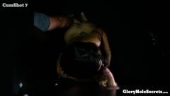 A linda morena adora chupar pênis e, em seu primeiro gloryhole, ela vai esvaziar as bolas de 10 caras.