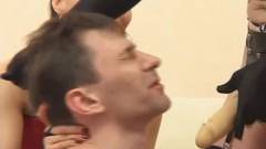 Duas amantes boazonas com botas e strapon se divertem com um cara obediente amarrado e submetido a suas fantasias mais brutais