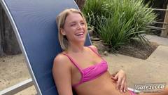 Evelyn está desesperada para ser fodida depois de tomar sol junto à piscina. Ele vai encher a vagina dela com seu esperma