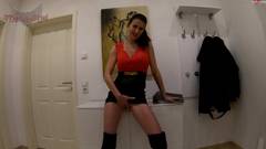 A morena sexy nunca usa calcinha quando ela quer convencer um cliente a comprar uma casa. Hoje, ela vai chupar um pau e vai ser fodida nas escadas.