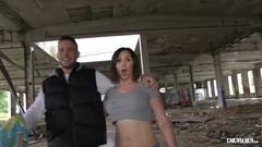 Essa morena vadia da Yasmin Scott exibe a sua xoxota gostosa nesse prédio abandonado e pega garganta profunda num grande galo