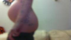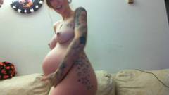 Na frente de sua camera, a mulher grávida mostra seus seios cheios de leite e sua grande barriga. Ela também mostra sua buceta e seu traseiro