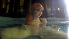 Uma cabra ruiva senta-se numa piscina cheia de água e acaricia a sua cona com os dedos. Vejam como ela é marota e sexy!