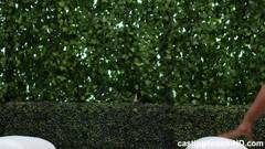 Ela exibe seus peitos grandes antes da chegada de dois negros bem dotados. Ela é chupada e fodida antes de engolir o esperma como um gourmet.