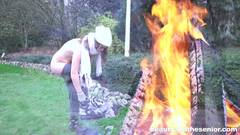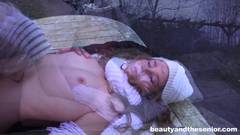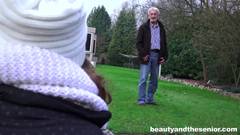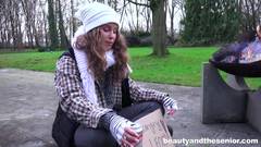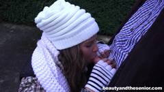 A jovem e bonita garota de cabelos cacheados está com fome e não tem para onde ir. O velho pervertido a faz chupar seu pau em troca de comida.