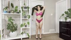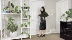 Ela adora nos excitar com saltos altos e saia comprida. Ela fica nua e começa a acariciar suas enormes mamas e depois se empalar num grande dildo.