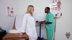 A médica sexy Joslyn tem um fraquinho por seu atraente enfermeiro negro e ela o provoca até que ele enfie seu grande pinto na buceta dela.
