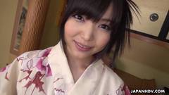 A bela garota japonesa com o sorriso devastador vai mostrar suas habilidades de chupar pênis na visão da POV, ela tem um bichano peludo.