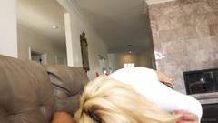 A bonita e sexy gata loura com os peitos grandes chupa pilas, bolas, desliza a pila entre os peitos, esvazia as bolas. Ela é mesmo uma vagabunda!