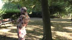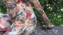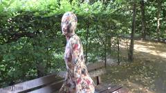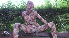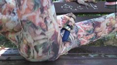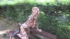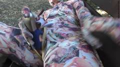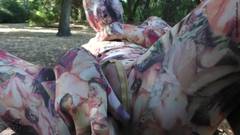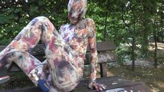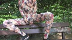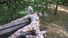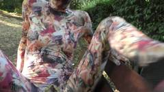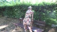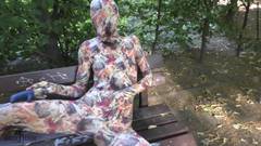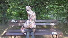 A vagabunda foi ao parque usando uma fantasia floral de látex que cobre todo o seu corpo, inclusive a cabeça. Há apenas uma abertura para a xoxota dela.