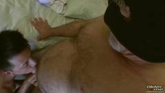 Um velho com uma máscara facial está à espera de um jovem latino num quarto de hotel. O rapaz vai começar com um broche e depois com posições de foda dura.