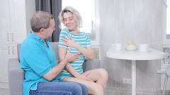 A jovem tira a calcinha, agrada o velho com um pequeno boquete antes de arquear a bunda para ser penetrada.