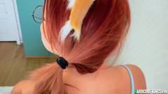 Sweetie Fox, ruiva e sexy, com óculos e meias azuis, chupa um pau enorme em POV com o cu plugado, depois enfia um pau enorme no cu