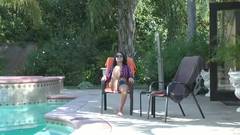 Dillion e sua amiga relaxam na piscina conversando. Dillion se gaba do pau de seu namorado e acaba no sofá com ele!