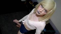 Mila Swift loira trans fica em frente da câmara e diz algo sensual enquanto coloca a sua grande pila no berço com a mão. Uma cena extremamente tentadora