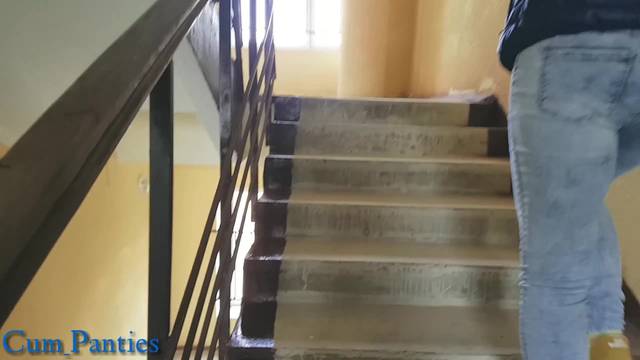 Uma jovem vagabunda encontra um cara na escadaria. Ele puxa um pinto grande, ela puxa a calcinha para baixo para que ele possa olhar para a xoxota e gozar