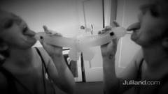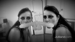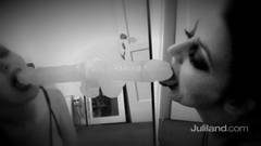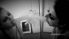 Excitante vídeo em preto e branco da exuberante Sophie Dee chupando um dildo preso num espelho.