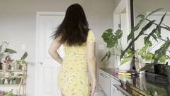 A morena de rosto bonito tem seios grandes, um rabo grande e uma buceta bem raspada que ela acaricia com os dedos, ela é excitante!