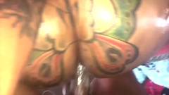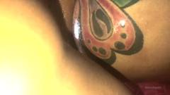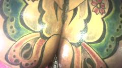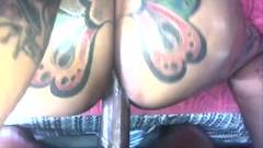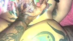 O cara filma a bunda grande e tatuada de sua namorada. Ele derrama óleo sobre ela e a pega no estilo cachorrinho, esvaziando suas bolas dentro dela!