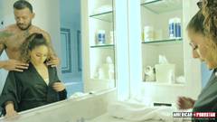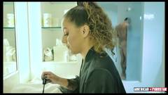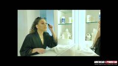 O negro com um pau XXL aparece no banheiro, coloca a garota de joelhos para que ele a chupe.