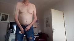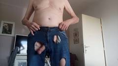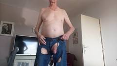 Ele é um velho pervertido com uma grande pila que adora compartilhar conosco usando jeans rasgados enquanto sua pila é mostrada nos buracos