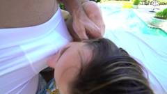 Essa morena se lubrifica na piscina e depois vai curtir o pau grande do careca, com uma boa foda antes de gozar na cara dele!