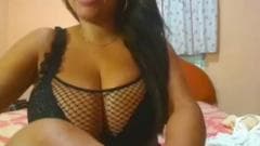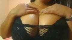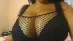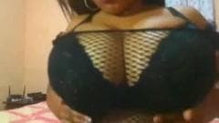 Vídeo amador de uma bela mulher negra redonda brincando com suas enormes mamas e um dildo para um pequeno trabalho de mão.