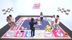Uma garota asiática está jogando um jogo de tabuleiro com outras garotas e desenha um quadrado com um cara com o pênis para fora.