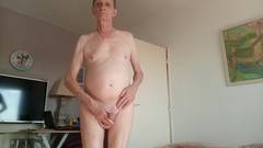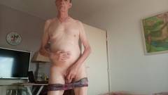 O velho pervertido tira a cueca e toca o pênis, começa a dançar e brinca com ele na frente da câmera, fazendo um show para seus fãs