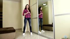 A morena de jeans e camiseta está se preparando para se despir gentilmente, ela adora fazer exibições, acariciando sua pequena vulva e sua pequena bunda.