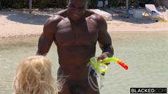 A linda loira Lika Star encontra um belo homem negro na praia. O cara musculoso tem um pau enorme e está ansioso para foder uma gostosa bem nessa praia!