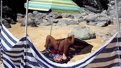 Lisa, nua em uma praia pública, abre as coxas para fazer xixi e acaricia a buceta na toalha de praia.