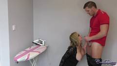 A Simmer Rose é uma boa dona de casa que chupa o pau do marido e de um amigo para receber duas grandes doses de esperma em seu rosto!