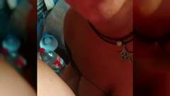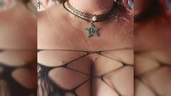 Uma mulher madura em lingerie sexy tem grandes mamas que seu amante ama. O cara fica excitado tocando-lhes com seu pinto e babando neles.