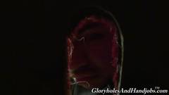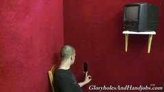 David Madrid está numa sessão de broche através de um buraco na parede. O pau é preto e está crescendo e o seu próprio está ficando duro