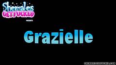 A Trans Grazielle Sanches é fodida por um grande pinto negro e se ejacula sobre as mamas e a barriga. Quente!