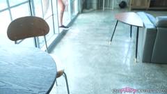 O cara levanta o edredom para ver a bela bunda da garota, que está usando uma bela calcinha fio-dental, e depois vem chupar a visão POV e transar.