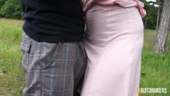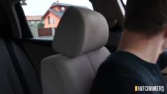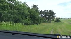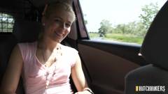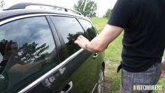 Uma linda loira esperando o ônibus entra nesse carro porque está tentada pelas pequenas loucuras do sexo! Ela não vai dizer não a esse pau!