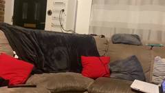 Eu me masturbo com meu grande dildo no sofá para que eu possa deixá-lo excitado e capaz de se fazer ejacular com a mão.
