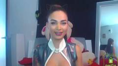 A gostosa amadora Trans, vestida de couro e com orelhas de gatinho, tem um pau gordo que ela vai masturbar para todos os seus fãs.