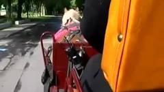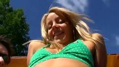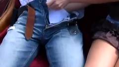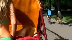 Casal sentado num carrinho a dar um passeio num jardim público. A loira atrevida abre o zíper do cara, puxa o pinto para fora e o bate ao lado dele