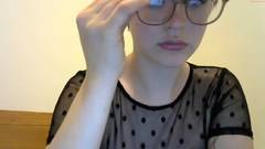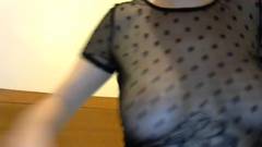 Uma garota amadora com cabelo curto e peitos grandes usa uma camiseta transparente e meias arrastão pretas enquanto toca sua buceta.