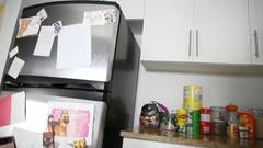 Essa garota amadora, ficou excitada em sua cozinha, então ela usa um vibrador para masturbar sua buceta apertadinha.