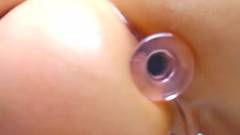 A loira encaixa o dedo no cu e coloca um tampão dentro dela para esticar o seu buraco do cu. Ela também se masturba com um dildo.
