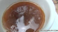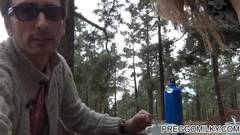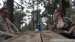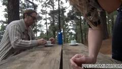 Um casal maduro foi fazer um piquenique na floresta. Estão sentados em uma mesa quando a mulher começa a mostrar suas grandes tetas para excitá-lo!