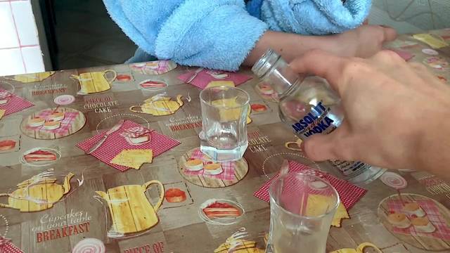 Esta mulher loira russa toma algumas doses de vodka antes de bombear a piça e deitar-se de quatro em quatro para a bela foda