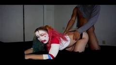Uma jovem vadia pintou o rosto de branco e os lábios de vermelho só para se divertir com um negro que vai acabar deixando que ela lhe faça sexo oral.